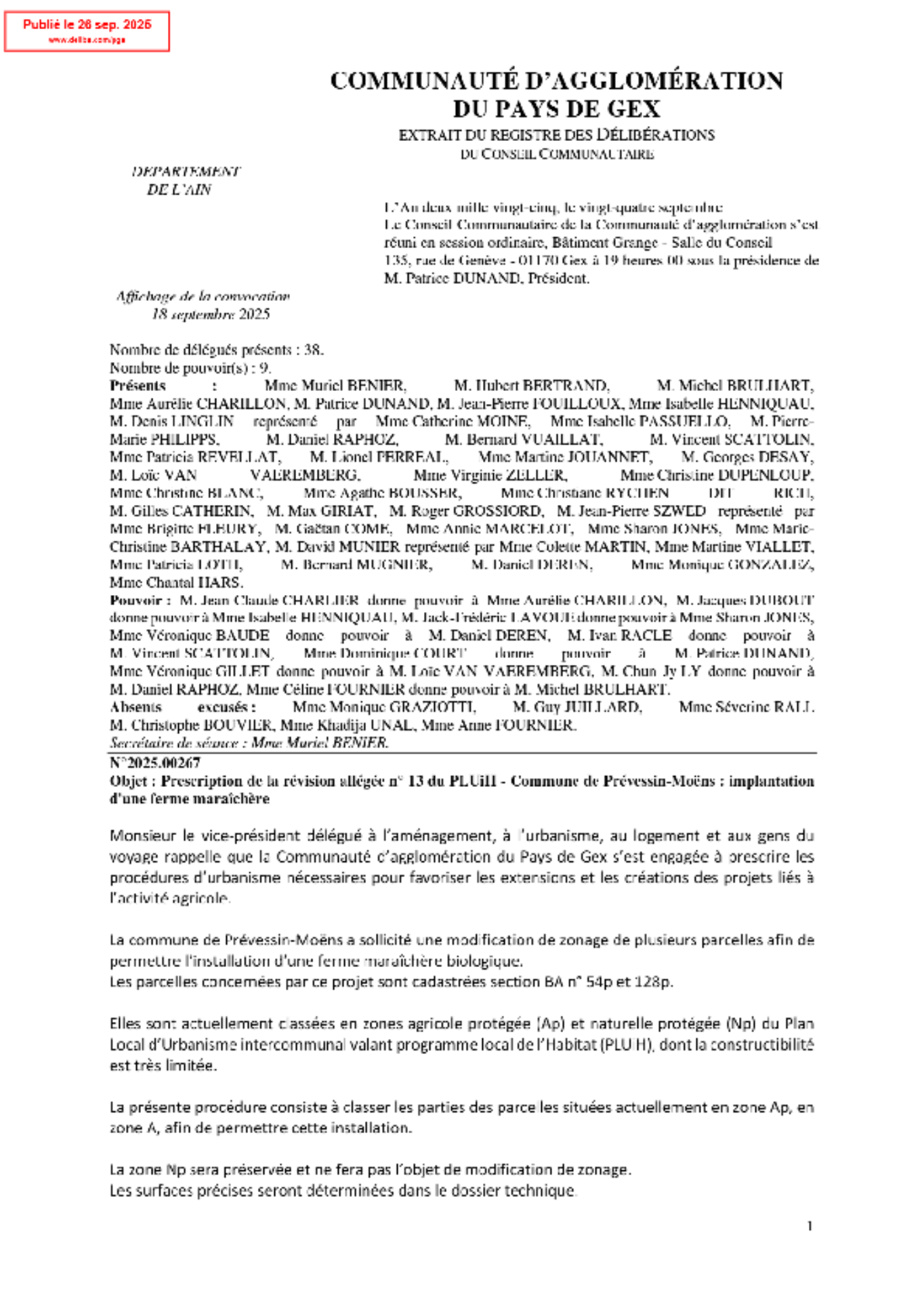 Par délibération n°2025.00267 en date du 24/09/2025, le président de la Communauté d’agglomération du Pays de Gex a prescrit la procédure de révision allégée n° 13 du PLUiH du Pays de Gex, et a fixé les modalités de la concertation.